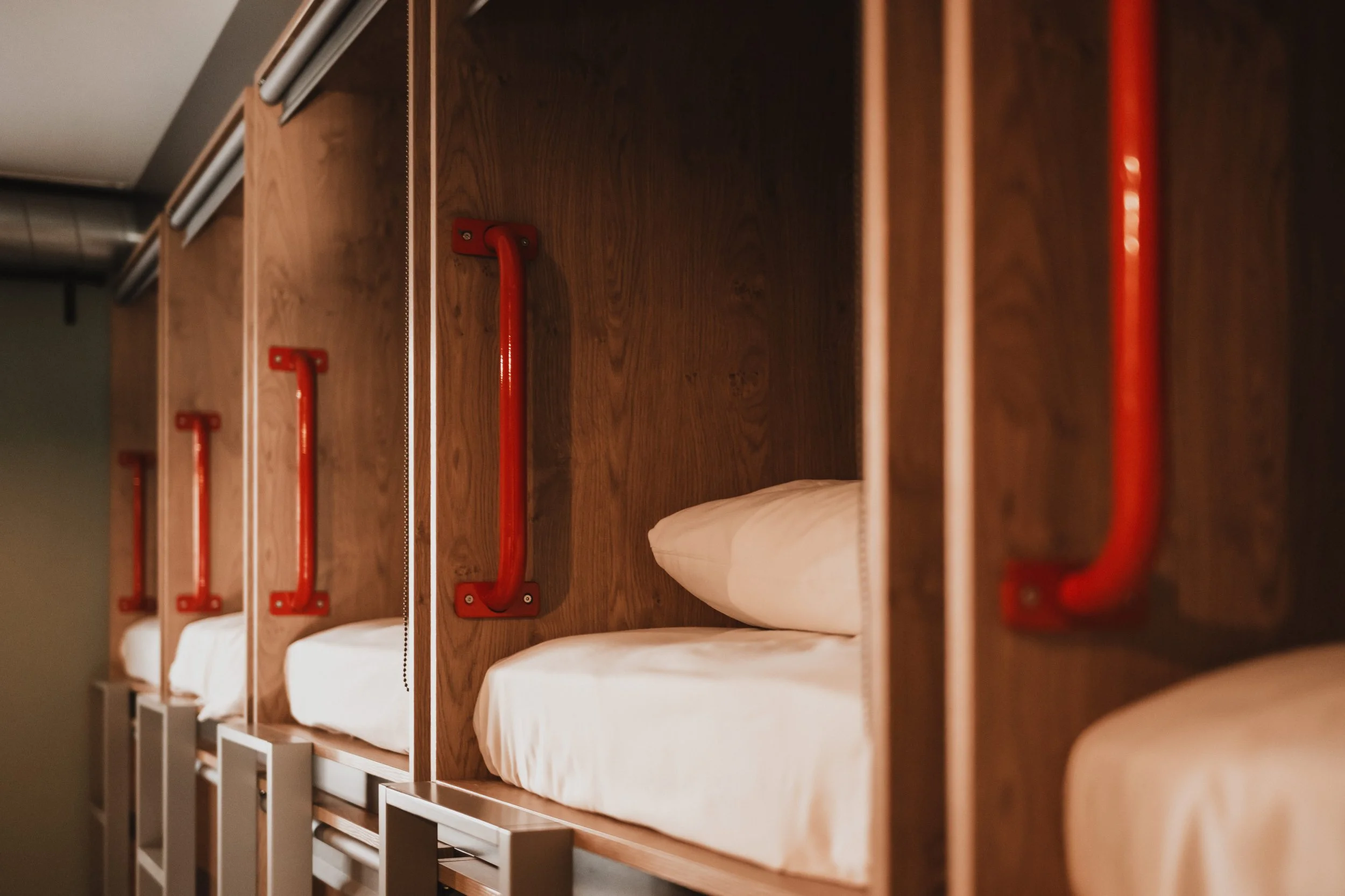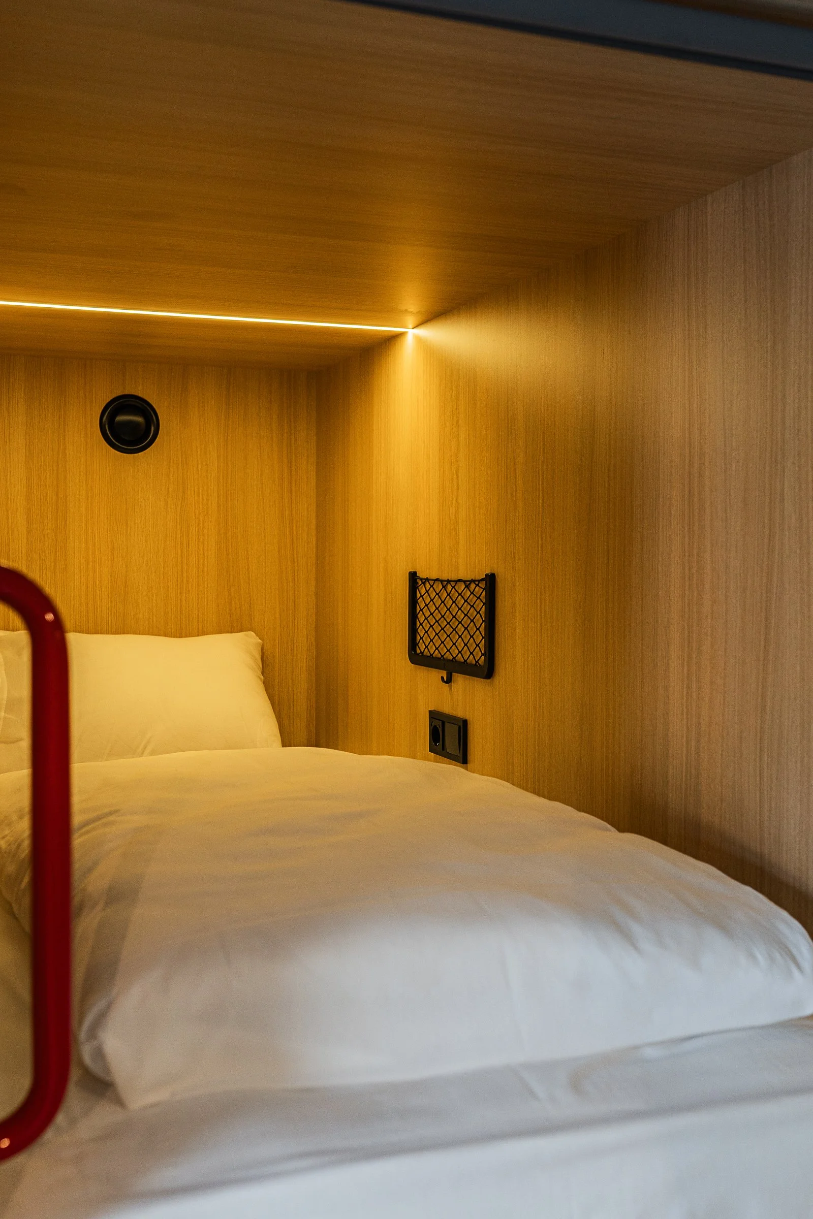 Each of our beds is equipped with a power socket with integrated USB-C and USB-A socket, its own light switch, a storage net and a roller blind for your privacy.